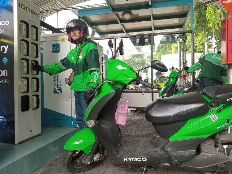 Pengemudi ojek online melakukan battery swap di box baterai di salah satu kantor PLN di Jakarta. (FOTO/Kabarindo.com).