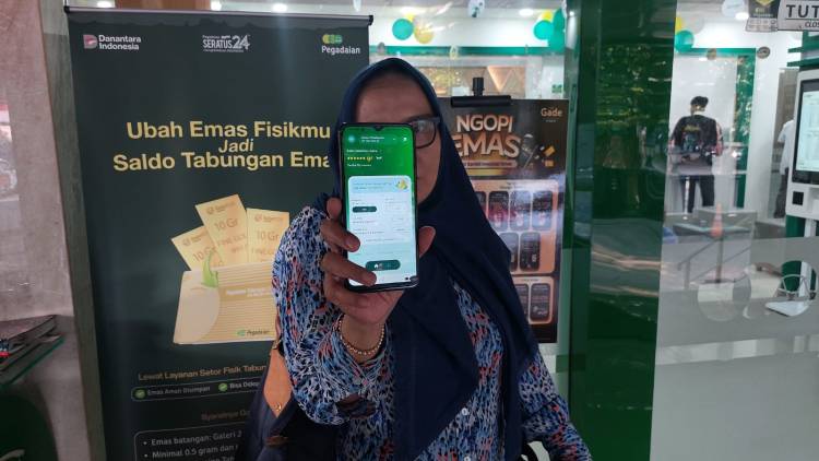 SUPER APP : Seorang nasabah Pegadaian menunjukkan Super App Tring! by Pegadaian yang menjadi ujung tombak Pegadaian dalam #mengEMASkanindonesia melalui beragam produk investasi. (FOTO : KABARINDO.COM/ANTON C)