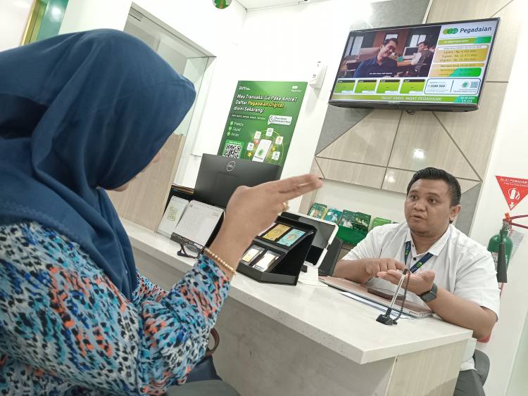 Nasabah mendapatkan penjelasan dari karyawan Pegadaian cabang Kebayoran Baru, Jakarta Selatan. (FOTO/ANTON C)